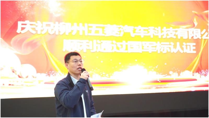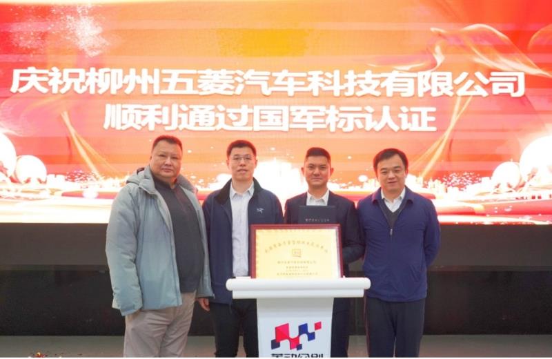 2024年3月4日,柳州五菱汽車科技有限公司(以下簡稱五菱科技)舉辦了武器裝備質量管理體系認證證書授牌儀式。北京軍友誠信檢測認證有限公司(以下簡稱軍友誠信)周濤總經理、謝志磊副總經理,廣西汽車集團有限公司陳曉峰副總裁,柳州五菱汽車科技有限公司田留勝總經理、廖睿副總經理出席會議。軍友誠信周濤總經理為五菱科技頒發了武器裝備質量管理體系認證證書和銅牌